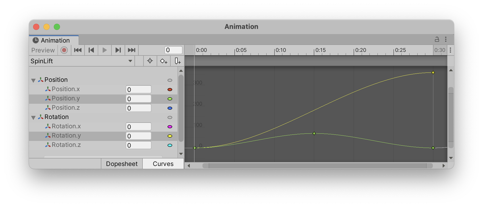Use any tool long enough, and it will start to get used for things beyond its original purpose. That has happened with Twoville. We enjoyed making physical things with it, and we wanted to use it to make icons and figures and visualizations. Some of these needed animations, so my collaborator Devran and I started exploring a system for programming animation. Many animation tools use a graphical keyframe editor, like this from the Unity game engine: